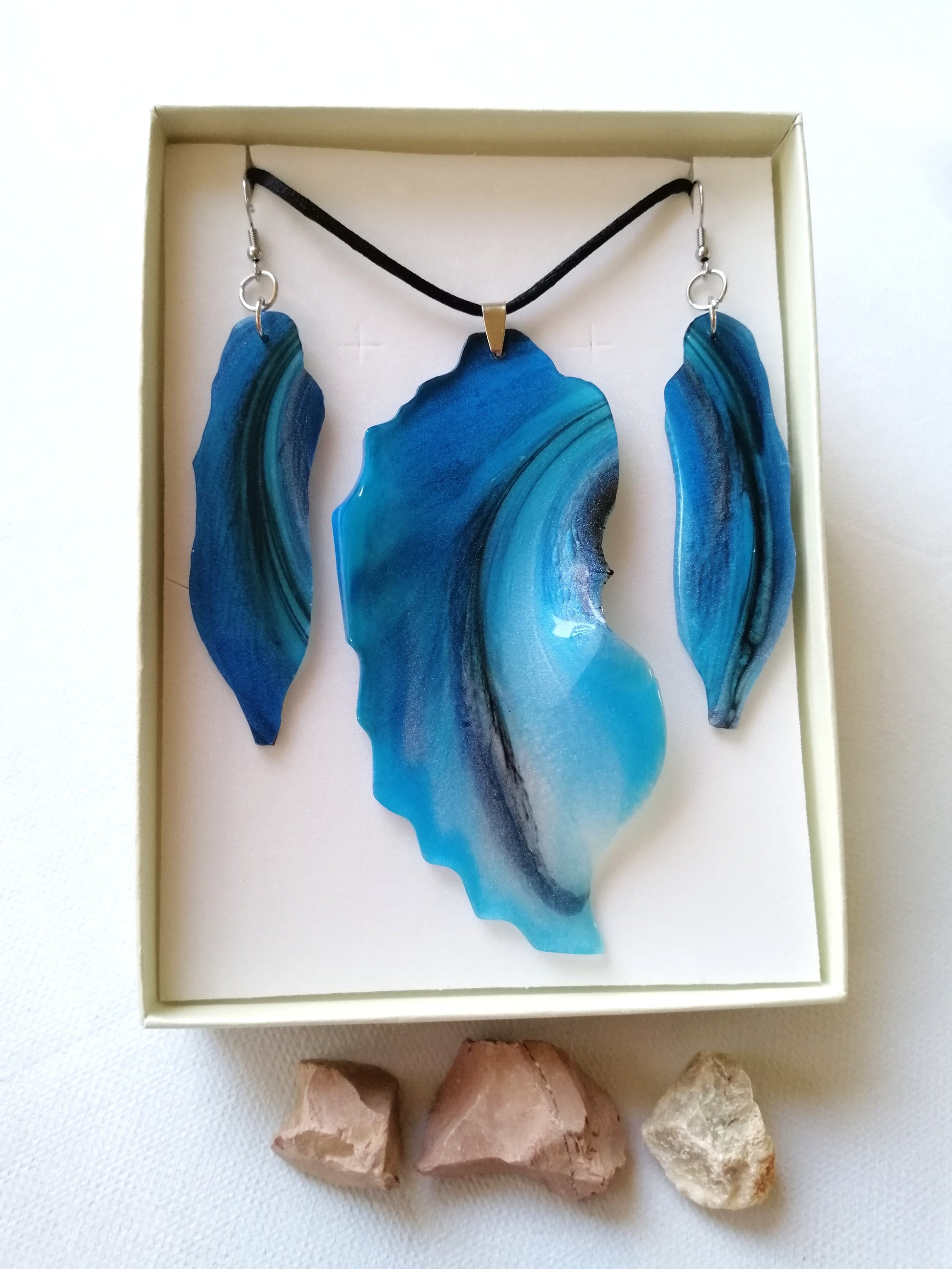 Cada pieza está elaborada con Resina Epoxi y moldeada meticulosamente a mano para conseguir la forma deseada. Su translucidez y brillo incomparables, se funde con tonalidades azules, creando una fascinante apariencia abstracta con personalidad y estilo.